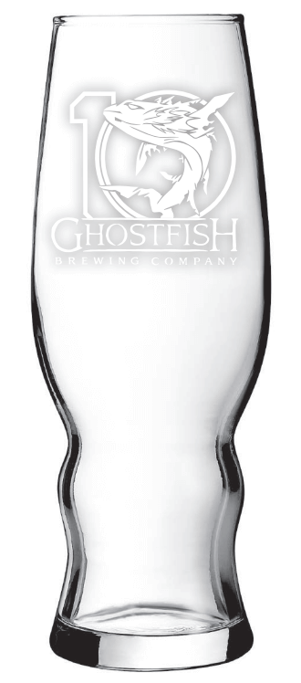16oz Medford style IPA glass with 1 sided Ghostfish 10th Anniversary logo print.