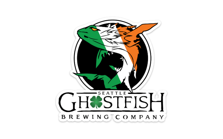Full Ghostfish Seattle Logo with a good luck four leaf clover and Ireland flag background in a 4″x3.81″ die cut sticker. Everyone needs a little “luck of the Irish”!