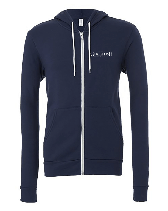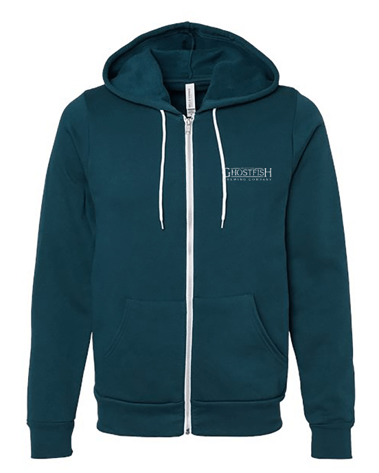 This incredibly soft and relaxed unisex full zip hoodie features a left chest Ghostfish text print and a full backside print of the classic Ghostfish logo. Made by Bella + Canva.